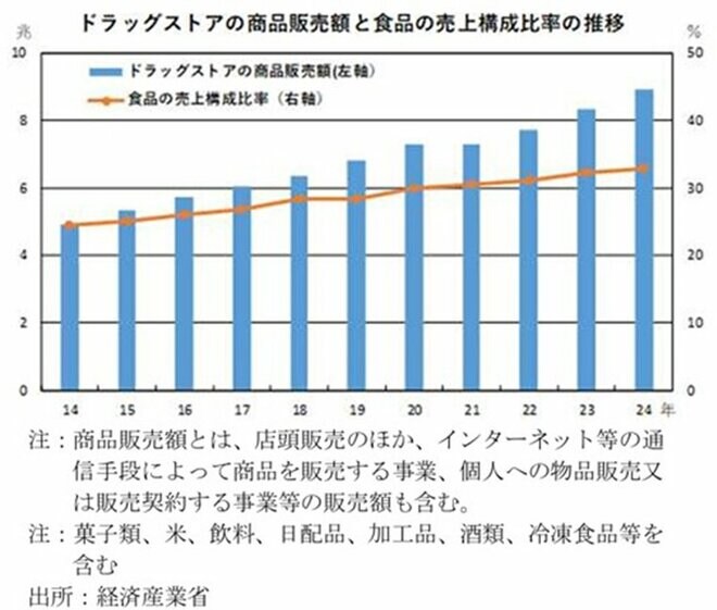 神様:おっしゃる通りです。ドラッグストア市場全体を見てみましょう。現在順調に伸びています。経済産業省によると、2024年の国内ドラッグストア市場は8兆9,199億円となり、2019年の6兆8,356億円から5年間で約1.3倍に拡大しました。日本チェーンドラッグストア協会では、2030年に13兆円規模への拡大を目標としていましたが、これも達成時期が早まりそうです。そして、この成長の牽引力となっているのは食品です。