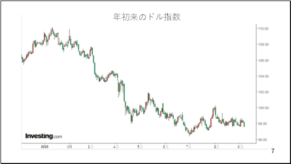 この結果、為替市場ではドル安が進みました。過去1年のドル指数を振り返りますと、7月までドル安が進んだものの、それ以降は関税交渉の進展と関税収入による財政悪化不安の緩和により、ドルが持ち直しました。一方、8月1日に発表された7月の雇用統計を受けて再び上値が重くなり、先ほどの8月雇用統計を受け、最近の安値圏までドル安が進んでいる状態です(スライド 7)。