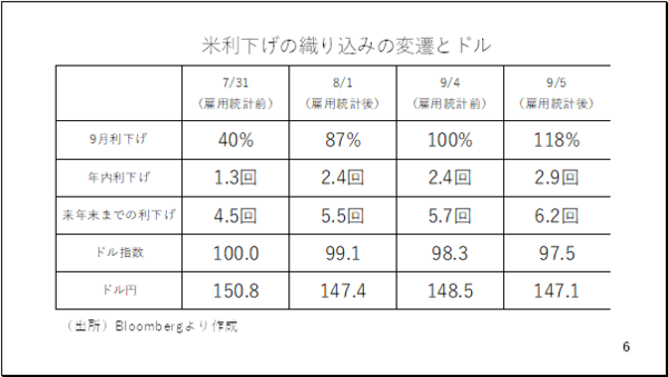 今回の雇用統計を受けて、市場での利下げの織り込みがさらに進みました。具体的には9月の利下げの織り込み度合いが118%まで上昇しました。これは25bpの利下げを完全に織り込んだ上、50bp利下げの可能性も18%織り込んでいることを意味します。また、来年の年末までの利下げの回数も雇用統計前は6回未満でしたが、現在6回の利下げを完全に織り込んでいます(スライド 6)。