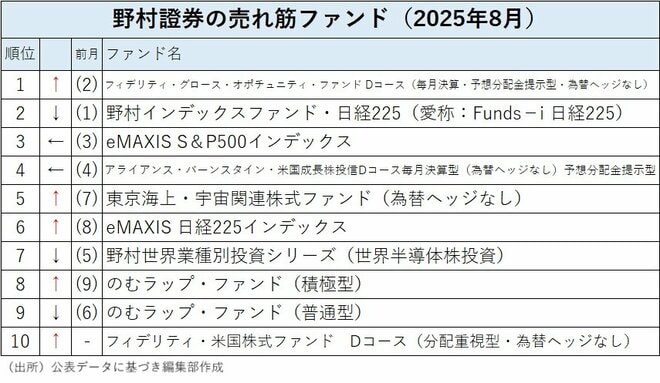 野村證券の投信売れ筋ランキングの2025年8月は、トップに「フィデリティ・グロース・オポチュニティ・ファンド Dコース(毎月決算・予想分配金提示型・為替ヘッジなし)」が立った。同ファンドは6月に第9位だったが、7月に第2位に上がり、ついにトップになった。前月トップの「野村インデックスファンド・日経225(愛称:Funds-i日経225)」は第2位に後退した。また、前月第7位だった「東京海上・宇宙関連株式ファンド(為替ヘッジなし)」が第5位に上昇し、トップ10圏外から「フィデリティ・米国株式ファンド Dコース(分配重視型・為替ヘッジなし)」が第10位にランクインした。前月は第10位だった「ピクテ・ゴールド(為替ヘッジなし)」はトップ10圏外に落ちた。