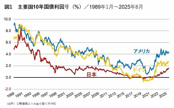 まずは図1で過去の日本・ドイツ・アメリカの金利水準とその動きをご確認ください。各国共に1990年代から2020年前後まで、約30年間にわたり金利水準が継続的に大きく低下しました。このような長期間に及ぶ世界的かつ大幅な金利低下はそれまで経験したことのないものであり、今後も起こる可能性は極めて低いであろうと考えられます。