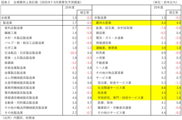 こうした中で、前年比の上方修正幅が大きい業種は「農林水産」「生活関連サービス」「学術研究、専門・技術サービス」「娯楽」「運輸・郵便」となっている。