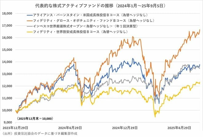 大和証券の売れ筋(ダイワのオンライントレード買付金額(総合)ランキング)において「アライアンス・バーンスタイン・米国成長株投信 Bコース(為替ヘッジなし)」は、5月以来4カ月連続でトップ(各月最終週のランキング)を維持している。高い利益成長もしくは持続的な利益成長の可能性が高いと判断される企業を選別し、魅力的な投資機会に投資していく代表的なアクティブファンドだ。2024年の前半までは「S&P500」インデックスファンドも上回る運用成績だったが、2024年後半以降は「S&P500」と同等かやや下回るパフォーマンスになってきた。米国株全般が買い進められる環境になると同ファンドのようにクオリティ銘柄を選別するファンドは埋没しやすい。