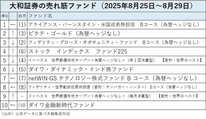 大和証券の投信売れ筋ランキングの2025年8月のトップは、前月と同様で「アライアンス・バーンスタイン・米国成長株投信Bコース(為替ヘッジなし)」だった。第2位に前月第3位の「ピクテ・ゴールド(為替ヘッジなし)」が上がり、前月第2位だった「フィデリティ・グロース・オポチュニティ・ファンド Bコース(為替ヘッジなし)」は第3位に後退した。そして、第4位に前月第6位だった「ストックインデックスファンド225」がジャンプアップした。前月第4位だった「インベスコ 世界厳選株式オープン<為替ヘッジなし>(1年決算型)」が第5位に、前月第5位だった「ダイワ・ダイナミック・インド株ファンド」が第6位に後退した。