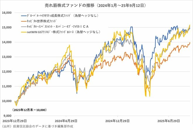 みずほ銀行の売れ筋トップ10にランクインしている株式ファンドのパフォーマンスを調べると、8月以降に米国株式に主に投資するファンドのパフォーマンスが良化していることがわかる。具体的には「キャピタル・インベストメント・カンパニー・オブ・アメリカ ICA」、そして、「netWIN GSテクノロジー株式ファンドBコース(為替ヘッジなし)」のパフォーマンスが急速によくなり、先行していた「グローバル・ハイクオリティ成長株式ファンド(為替ヘッジなし)(愛称:未来の世界)」にパフォーマンスで追いついている。また、グローバルに分散投資する「キャピタル世界株式ファンド」の出遅れが明確になってきた。
