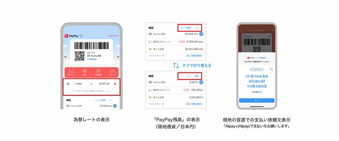 PayPayアプリの決済や送金が海外でも利用可能になる。「Alipay+(アリペイプラス)」加盟店でPayPayでの決済ができるうえ、個人間送金や残高チャージ、PayPayポイントを「貯める」「使う」機能も同様に利用可能。さらに、為替レートは常時表示、PayPay残高も日本円と現地通貨で切り替え表示、さらに現地の店員への提示はローカル言語で表示される仕様など旅先ならではの便利機能も。