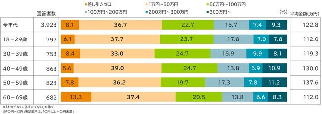 年代別に分析すると、どの年代でも「1年あたり1万円~50万円」が最多になっています。