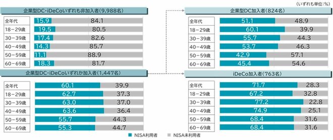また、会社の制度である「企業型DC」の利用者では、約5割がNISAを利用、自ら能動的に申し込む「iDeCo」利用者では約7割と更に高いことが分かりました。