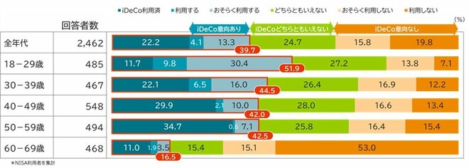一方で、「(現在利用していないが、)利用意向がある層」も含めると、一転して若年層の方が高い傾向になっていました。18~29歳でNISAを利用している若年層において、「iDeCoを利用している/利用意向がある」人の割合は51.9%に上ります。