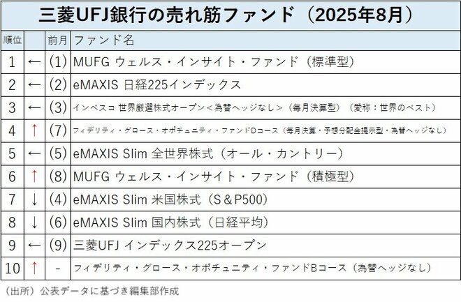 三菱UFJ銀行の投信売れ筋ランキングの2025年8月は、トップ3が前月と同じだった。トップが「MUFGウェルス・インサイト・ファンド(標準型)」、次いで、「eMAXIS Slim 国内株式(日経平均)」、「インベスコ 世界厳選株式オープン<為替ヘッジなし>(毎月決算型)(愛称:世界のベスト)」だった。第4位には前月第7位だった「フィデリティ・グロース・オポチュニティ・ファンドDコース(毎月決算・予想分配金提示型・為替ヘッジなし)」が上がり、前月は第4位だった「eMAXIS Slim米国株式(S&P500)」は第7位に後退した。前月第8位だった「MUFGウェルス・インサイト・ファンド(積極型)」が第6位に上がり、トップ10圏外から「フィデリティ・グロース・オポチュニティ・ファンド Bコース(為替ヘッジなし)」が第10位にランクインした。