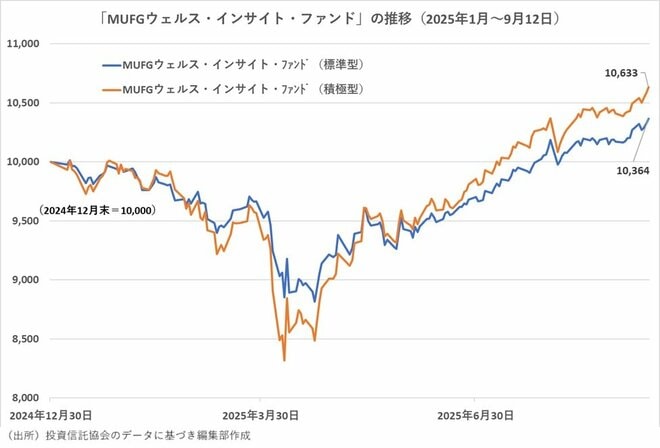 ただ、2025年5月以降のように、世界的に株式市場が上昇基調になってくると、株式への投資比率が高い「積極型」のパフォーマンスの力強さが注目されるようになる。特に、8月から9月にかけてうわ抜けてきたようにみえる「積極型」の上昇が、9月の米国利下げ後の動きにおいても維持されるものかどうか、今後の推移を見守りたい。