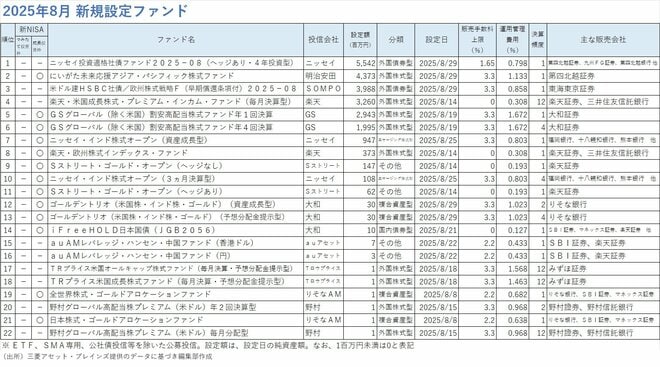 三菱アセット・ブレインズがまとめた2025年8月の公募投信(ETF、DC専用、SMA専用、公社債投信除く)の新規設定ファンド数は22本と前月(30本)から減少した。設定総額は約240億円と前月(約480億円)から半減、2025年では2番目に少ない設定額になった。新規設定額ランキング(設定額は設定日の純資産額)でトップは、ニッセイアセットの単位型ファンドである「ニッセイ投資適格社債ファンド2025-08(ヘッジあり・4年投資型)」の約55億円だった。第2位は「にいがた未来応援アジア・パシフィック株式ファンド」で約44億円、第3位の「米ドル建HSBC社債/欧州株式戦略F(早期償還条項付)2025-08」の約40億円が続いた。単位型ファンドの設定が目立っている他、「楽天・米国成長株式・プレミアム・インカム・ファンド(毎月決算型)」など株式の配当に着目したファンド、「ゴールデントリオ(米国株・インド株・ゴールド)」など株式とゴールドを組み合わせたファンドが複数本設定されている。