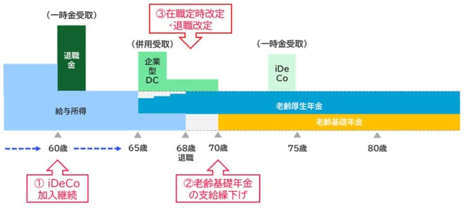 下記に会社員のiDeCoの加入継続と受け取り方の一例を表してみましたが、60歳で企業型DCの加入者でなくなった人が企業に継続雇用されていれば、iDeCoの加入は65歳まで継続することが可能となります。65歳以後は、老齢基礎年金を支給繰下げしてその期間はDCを年金受け取りすることで公的年金等控除を受けながら受け取ることが可能となります。さらに、企業型DCをiDeCoへ移管せず、異なる年に一時金を受け取ることで、一度に受け取る金額を低く抑えて、低い税率を適用できるようにするといったことなども検討してはいかがかと思います。