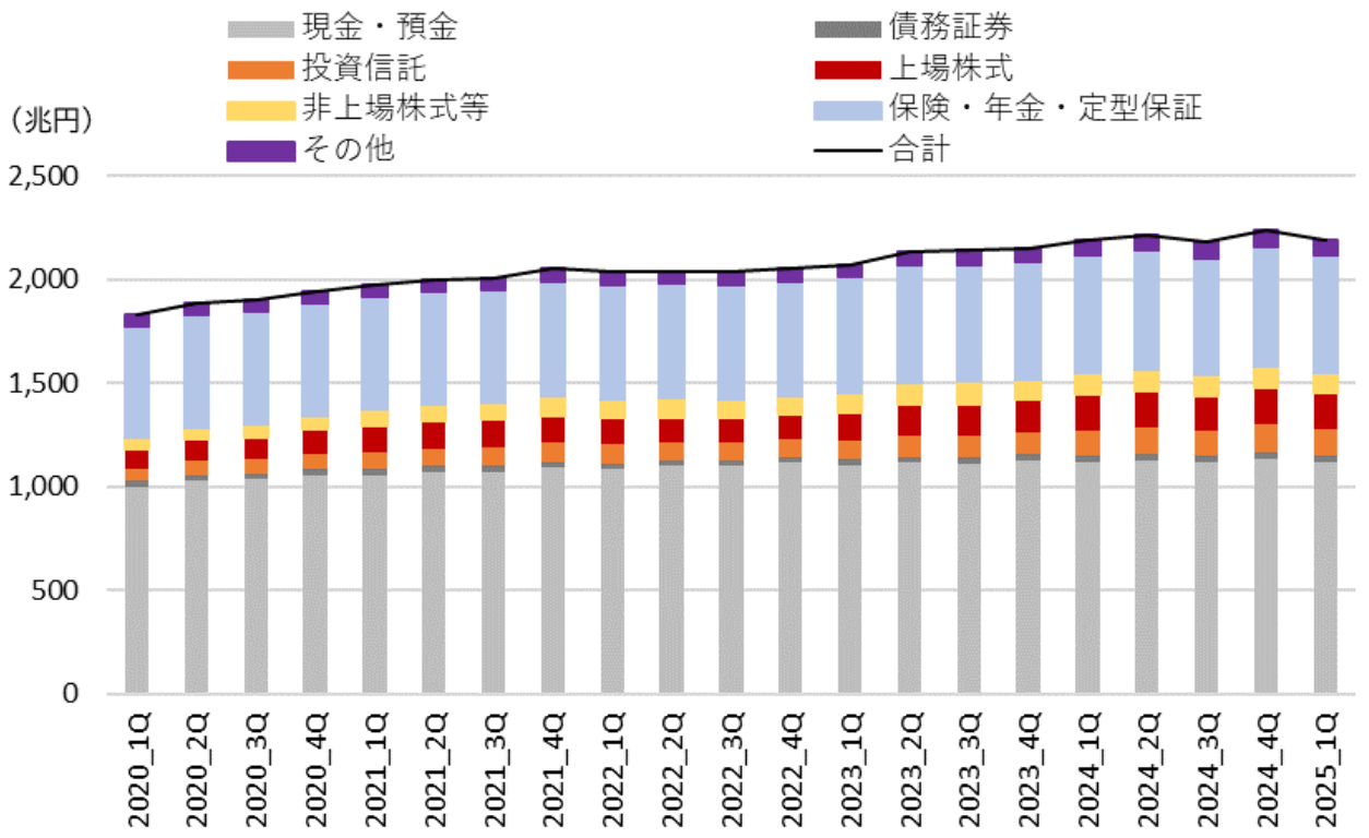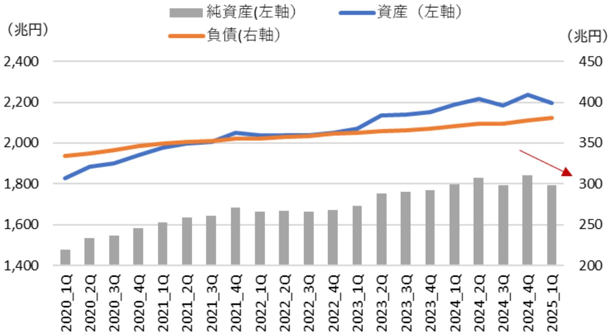 2025年3月末の家計金融資産残高(グロス)は、2,195兆円と過去3番目の高水準となりましたが、四半期(1-3月期)では▲42兆円減少し、この間に金融負債が+7兆円増加したため、金融資産から負債を控除した純資産残高は▲49兆円と一段と減少して1,793兆円となりました〔図表2-1〕。