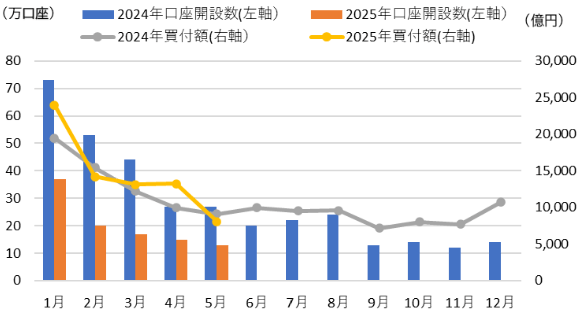 2025年3月末時点でのNISA口座数は、2,647万口座(18歳以上人口の4人に1人が開設)、買付額は累計で59兆円となり、政府が掲げた資産所得倍増プランでの2027年時点の目標数値との比較では、買付額累計こそ目標値の56兆円をすでに上回っていますが、口座数は目標値3,400万口座の8割弱の水準に留まり〔図表3-1〕、2025年に入ってからの月次の口座開設数(大手証券会社10社ベース)でみても、前年対比でのペースダウンは明らかになっています〔図表3-2〕。