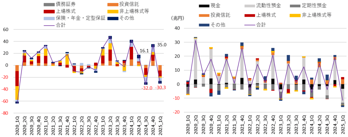 資産別でみると〔図表2-2、図表2-3〕、▲12兆円の資金の純流出(一般的な賞与支給月を含まないため、資金の純流出が進みやすい時期に該当)に加え、この間の株安・円高の動きに伴う時価変動▲30兆円(うち上場株式・非上場株式等が▲12兆円、投資信託が▲9兆円)が影響し、残高全体は前期末(2024年12月末)比で▲42兆円の大幅減少となりました。