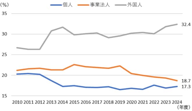次に、2024年度の株式分布状況の調査結果をみると、全体に占める個人の金額ベースでの保有比率は17.3%と、前年度から0.4ポイント増加しましたが、金額自体では前年度比▲6兆2034億円減の164兆2858億円となり、保有比率も2014年以降ほぼ横ばいに留まっています〔図表4-1〕。