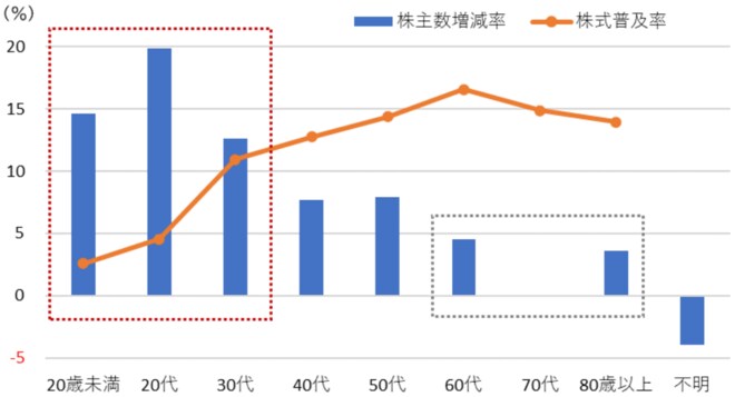 〔図表4-3〕新NISA開始以降の個人株主数(実質)の年代別増減率と年代別株式普及率