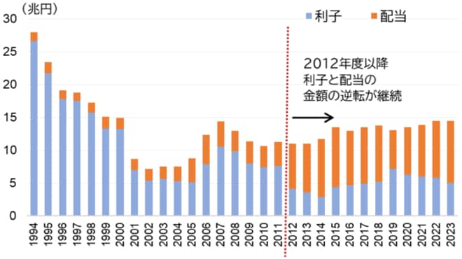 1994年度に家計が貯蓄で得た利子は26.6兆円、投資による配当は1.4兆円であったのが、2012年度以降利子と配当の金額が逆転した状況が継続しましたが、2023年度には利子5.0兆円、配当9.5兆円となり、合計した家計の金融資産所得は1994年度の28兆円から2023年度は14.5兆円と半減したままになっています。つまり、1990年代半ば以降金利低下で預金利子が減る一方で、2010年代前半からは株式等の配当が増えていますが、それまでの預金利子の減少を補えるほど配当も大きく増えていないことが影響しています〔図表4-4〕。