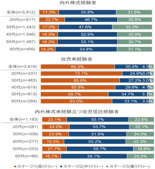 次に、内外株式投資経験者、投資未経験者、内外株式投資未経験且つ投資信託投資経験者と金融リテラシーとの関係性について調べてみると、内外株式投資経験者の方が、投資未経験者とくらべて金融リテラシーステージ3(高リテラシー)の割合が約25ポイント高く、内外株式投資未経験且つ投資信託投資経験者とくらべても約9ポイント高い結果となり、内外株式投資経験者が、投資未経験者対比では当然ながら、内外株式投資未経験且つ投資信託投資経験者対比でも金融リテラシーが高い結果が示されました。