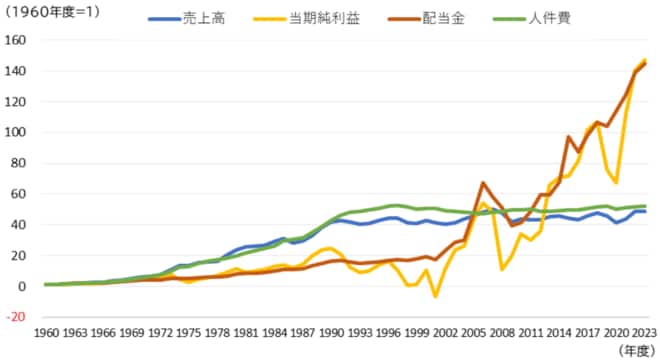 一方、金融・保険業を除く資本金10億円以上の大企業について、人件費や配当金等の推移(1960年度から2023年度まで)をみると、配当金は一時的な乖離は見られるものの、趨勢としては当期純利益に連動している傾向が確認でき、2009年度以降は金額自体も急激に増加しています〔図表4-5〕。