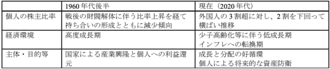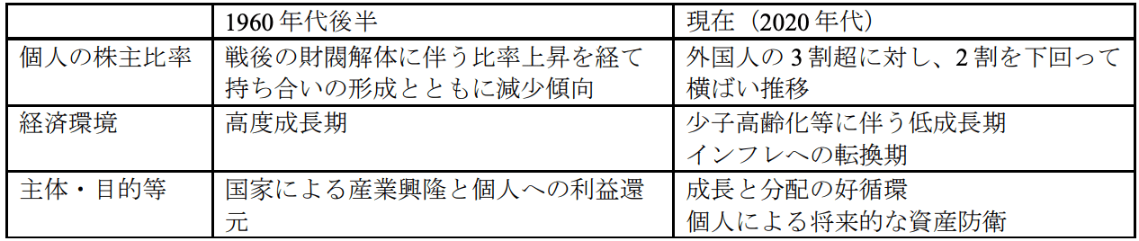 松下幸之助翁が論文を発表した1960年代後半と現在とを比較すると、個人の株主比率の低迷という点では共通するものの、時代背景等は下記のように異なります。
