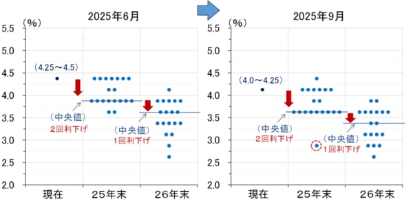 米連邦準備制度理事会(FRB)は9月16~17日に開催した米連邦公開市場委員会(FOMC)で政策金利を9カ月ぶりに0.25%引き下げ、4.0~4.25%としました。同時に公表された政策金利見通しのドットチャートは(図表1)、年内さらに2回、来年中1回の利下げを示唆しています。