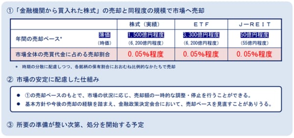 ETFの売却については年間3,300億円程度のペースとしており、日銀保有ETFが簿価で37兆円なので、全て売却するまでに112年かかることになります。日銀は、「所要の準備が整い次第、処分を開始する予定」としています。