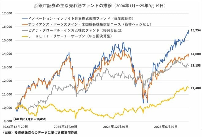 浜銀TT証券の売れ筋がパフォーマンス重視である点は、「イノベーション・インサイト 世界株式戦略ファンド」のランクアップにもみてとれる。このファンドは、他社のランキング上位には見られない。残高は「予想分配金提示型」と「資産成長型」を合わせても350億円程度と小さいファンドだ。「フランクリン・テンプルトン・イノベーション世界株式ファンド(適格機関投資家専用)」に投資することで、実質的にイノベーション企業の中から持続的な成長性が期待できる企業の株式に投資する。組み入れ銘柄の約8割は米国になっており、組み入れ上位銘柄は、エヌビディア、アマゾン、マイクロソフト、ブロードコム、メタ・プラットフォームズ、アルファベットなどとなっており、投資銘柄の顔ぶれは「アライアンス・バーンスタイン・米国成長株投信」とあまり変わらない。それぞれの銘柄の組み入れ比率や個々の売買タイミングなどの違いが、パフォーマンスの差になっている。