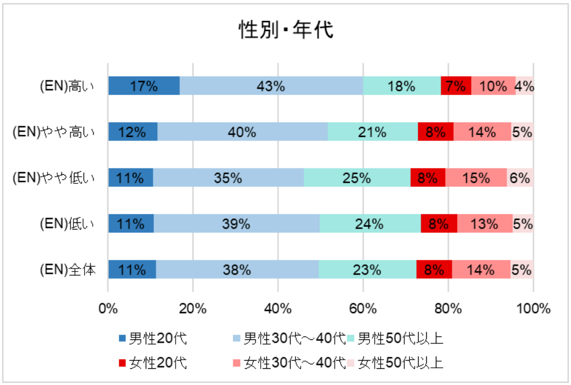 これを従業員エンゲージメントレベル別にみると、従業員エンゲージメントレベルが高いほど 20 代~40 代の若手・中堅層の男性割合が増加し、50 歳以上のベテラン層の男性、30 代~40 代の中堅層女性の割合が減少する傾向にある。一般的に、男性の多くが業務の中核人材として活躍の場が与えられるのに対し、中堅層女性は有価証券報告書等で開示されているように男女の賃金・管理職登用比率等の格差に直面したり子育てとの両立に悩む人が多い世代であること、50 歳以上男性は役職定年などを迎え職責・業務内容などに変化があることなどが影響していると推察される。