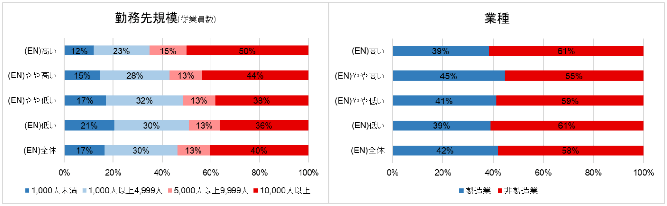 従業員エンゲージメント別にみると、従業員エンゲージメントが高いと規模(従業員数)の大きい企業割合が高い傾向にある。業種別では大きな変化はみられない。