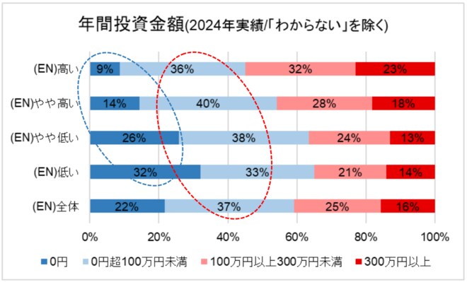 まず従業員エンゲージメントレベルごとの資産形成行動にどのような違いがあるのかを、年間投資金額とその財源を通して検証する。