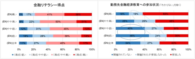 FWB ステージ・金融リテラシー得点の向上に有効な機会として金融経済教育が考えられるが、勤務先の金融経済教育*12への参加割合も、従業員エンゲージメントレベルが高いと参加割合が高い傾向にある(図表 14)。そして、ここでの特徴として次の 2 点が挙げられる。