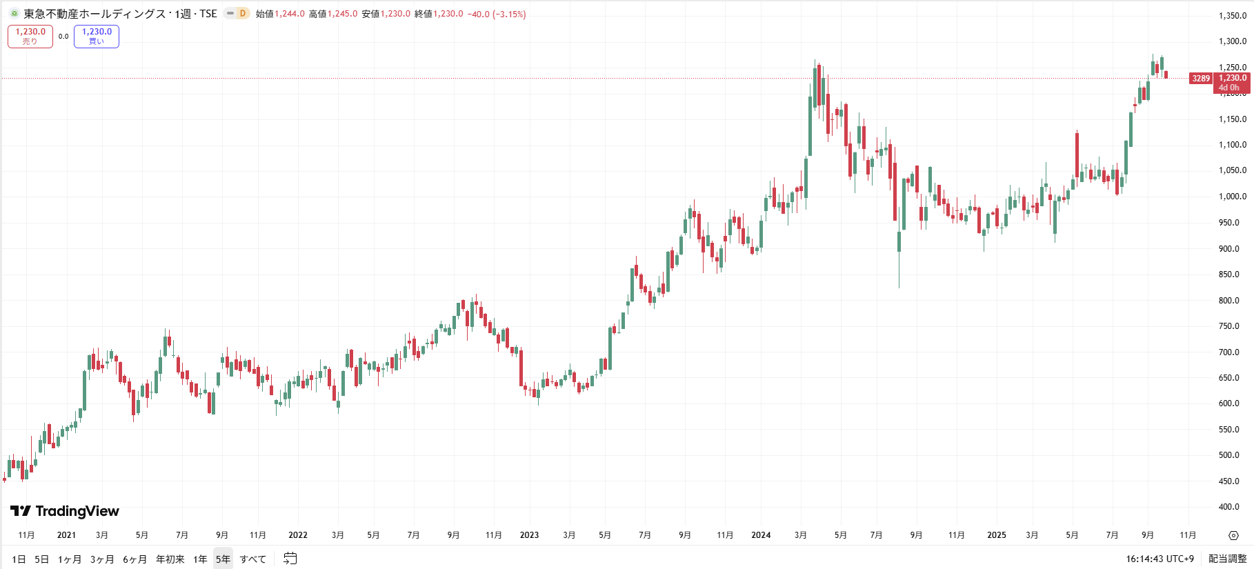 しかし、株価は25年7月に再び強く上昇します。同月初に公表された路線価で地価の上昇が確認されたことや、サッポロホールディングスが売却を検討中の不動産事業に東急不動産ホールディングスが応札を準備しているとの報道があり、期待感から買いが向かったと考えられます。9月には上場来高値となる1277円まで買われました。