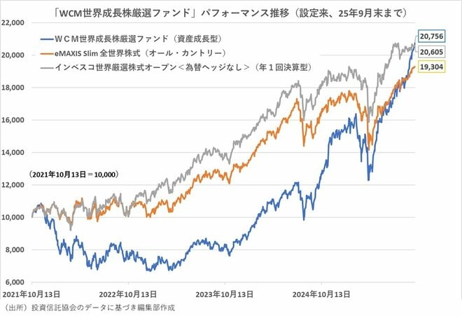 過去のパフォーマンス(分配金を払い出していないコースでトータルリターンを比較)を振り返ると「インベスコ 世界厳選株式オープン」は2022年以降に明確に全世界株式(オール・カントリー)インデックスを上回るパフォーマンスをみせていたが、「WCM世界成長株厳選ファンド」は2024年8月以降の上昇率が圧倒的だ。設定時の2021年10月13日を基準とすると、2025年9月末時点では「インベスコ 世界厳選株式オープン」を抜き去ってしまった。