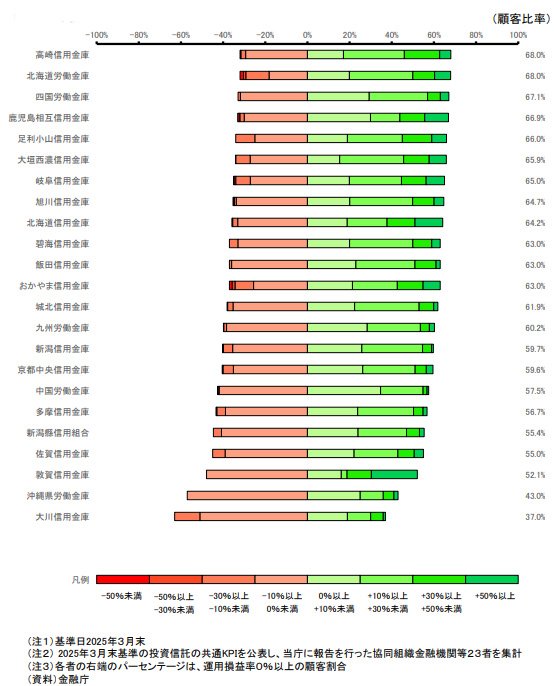 なお主要行、地域銀行、協同組織金融機関等(信用金庫、信用組合、労働金庫)、証券会社等の全業態平均で見ると71.8%の顧客がプラスのリターンを確保している。47の協同組織金融機関等のうち平均を超えたのは17だった。