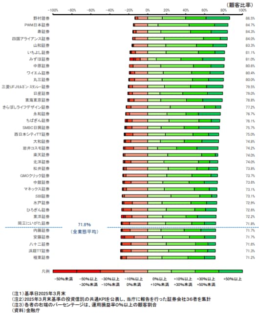 顧客の投資信託の運用損益に関する共通の指標の一つに「運用損益別顧客比率」がある。投資信託の共通KPIと呼ばれるその最新データは各金融機関が公表しており、金融庁がまとめて最新版を2025年9月10日に発表している。その中から証券会社に焦点を当てて運用損益率プラスの顧客の状況を確認していこう(2025年3月末基準)。