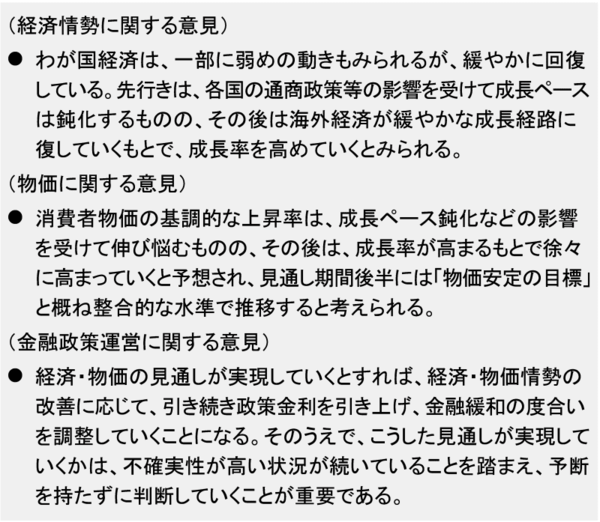 図表1に、今回の「主な意見」の三つの項目(「経済情勢」「物価」「金融政策運営に関する意見」)で、それぞれ一番目に掲載された意見を抜粋しました。これが日銀の今の公式見解になります。