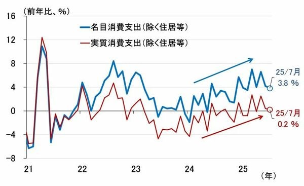 一つ目の意見は、個人消費に対する前向きな見方を示したものですが、どのような指標に基づいた見解か明らかではありません。家計調査を見ると(図表3)、確かに名目および実質消費支出は緩やかな回復トレンドをたどっていますが、10月7日に日銀が発表する8月の消費活動指数を確認する必要があるでしょう。