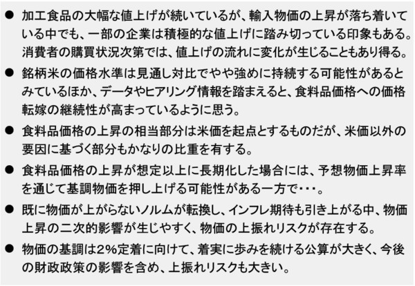 特に、ここ2回のMPMでは、物価上振れリスクを指摘する意見が増えており、今回も全8個の意見のうち図表5に示した6個が、物価上振れリスクを意識したものとなっています。