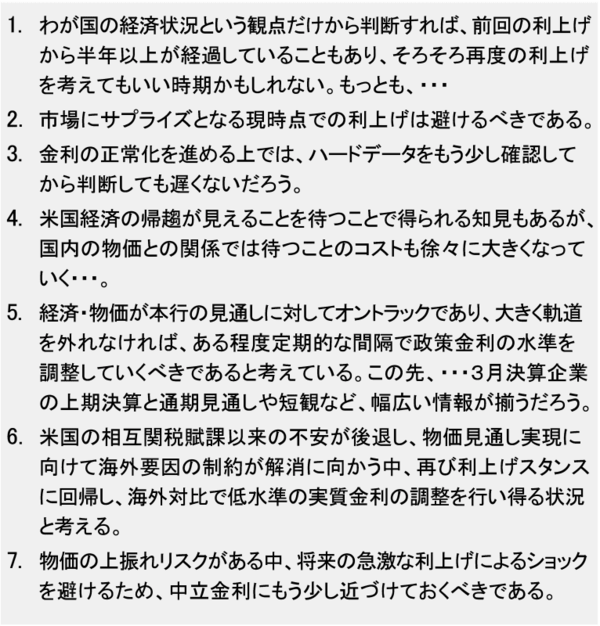 今回、「金融政策運営に関する意見」に掲載された意見は全部で16個。このうち上場投資信託(ETF)の処分方針に関するものが6個、政策金利に関するものが10個でしたが、その10個のうちなんと7個が、利上げが近いことを示唆しています(図表6)。以下、簡単に解説しましょう。