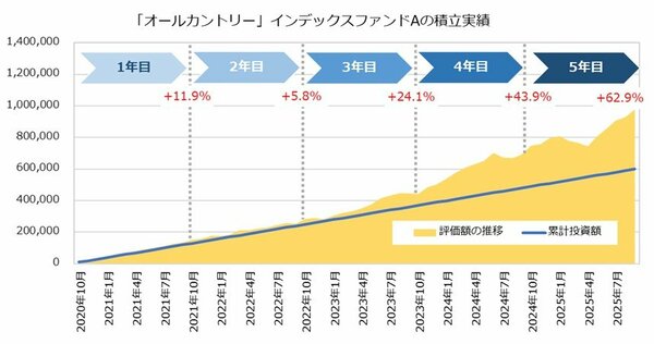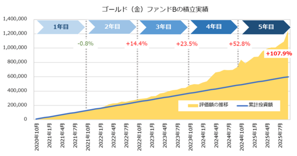 2025年9月末からさかのぼること過去5年間の積立パフォーマンスを比較すると、意外な事実が浮かび上がる。積立開始当初から右肩上がりを続けたオールカントリーよりも、調整を挟みつつ最終的に上昇した金の方が積立効果は大きかったのである。