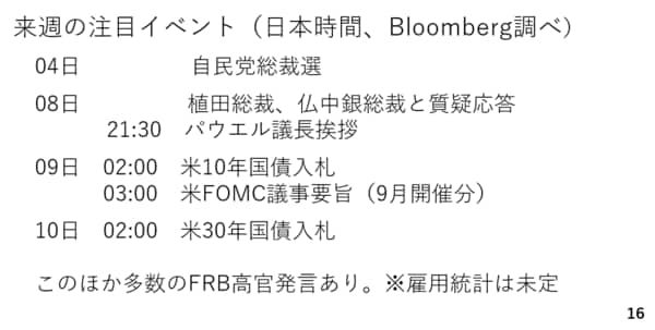 では、来週のポイントを見ておきましょう。来週は週末の自民党総裁選挙の結果を受けて週初より相場が大きく動く可能性が高いと言えます。そのほかでは植田総裁やパウエル議長の発言機会も控えており、金融政策の動向にも注目が集まります。現時点では雇用統計がいつ発表されるのかまだわかっていません。