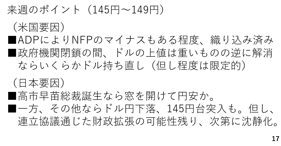 また、株式相場も財政拡張路線を歓迎して上昇するとみられ、株高によるリスク選好も円売りも想定されます。反対に小泉氏や林氏が総裁となった場合、これまでの反動からやや円高となりそうです。ただ、連立相手とみられる各党も財政拡張路線であることから、結局のところ誰が総裁になっても財政拡張へ舵が切られそうです。
