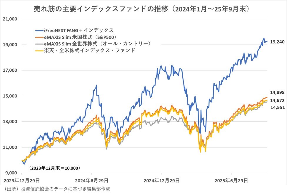 楽天証券の売れ筋ランキングの上位で9月に評価を高めたのは「iFreeNEXT FANG+インデックス」だった。同ファンドは、「FAANMG(Meta Platforms、Apple、Amazon、Netflix、Microsoft、Google)」の6銘柄を組み入れ、加えて、「時価総額(35%)」、「1⽇平均売買⾼(35%)」、「直近12カ⽉株価売上⾼倍率(15%)」、「直近12カ⽉売上⾼成⻑率(15%)」でランキングした上位4銘柄を加えた10銘柄で構成される指数に連動する成果をめざす。次世代テクノロジーをベースに、現代社会において人々の生活に大きな影響力を持ち、高い知名度を有する米国の代表的な企業で構成されている。9月末時点での追加4銘柄は、NVIDIA、BROADCOM、SERVICENOW、CROWDSTRIKEだ。これら銘柄群はAI関連でもあり、2023年から24年にかけて人気化し、割高な水準にあると警戒されてきた銘柄群ともいえる。