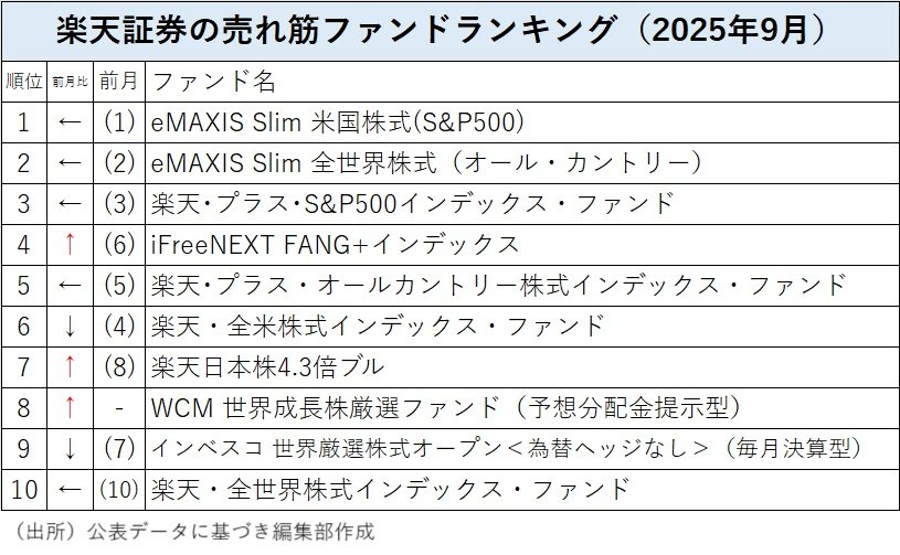 楽天証券の投信売れ筋ランキングの2025年9月のトップ3は前月と同じになった。「eMAXIS Slim 米国株式(S&P500)」をトップに、第2位は「eMAXIS Slim 全世界株式(オール・カントリー)」(愛称:オルカン)、第3位は「楽天・プラス・S&P500インデックス・ファンド」だった。第4位には前月の第6位から「iFreeNEXT FANG+インデックス」が上がり、前月第4位の「楽天・全米株式インデックス・ファンド」は第6位にまで後退した。そして、トップ10圏外から「WCM 世界成長株厳選ファンド(予想分配金提示型)」が第8位にランクインした。