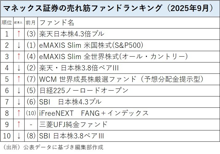 マネックス証券の2025年9月の投信売れ筋ランキングのトップに立ったのは前月第3位の「楽天日本株4.3倍ブル」だった。前月トップの「eMAXIS Slim 米国株式(S&P500)」は第2位に後退し、第3位には前月第4位だった「eMAXIS Slim 全世界株式(オール・カントリー)」が浮上した。前月第2位だった「楽天・日本株3.8倍ベアIII」は第4位に後退した。また、前月第7位だった「WCM世界成長株厳選ファンド(予想分配金提示型)」が第5位に、前月は第10位だった「iFreeNEXT FANG+インデックス」が第8位にランクアップした。トップ10圏外から「三菱UFJ純金ファンド」が第9位にランクインした。