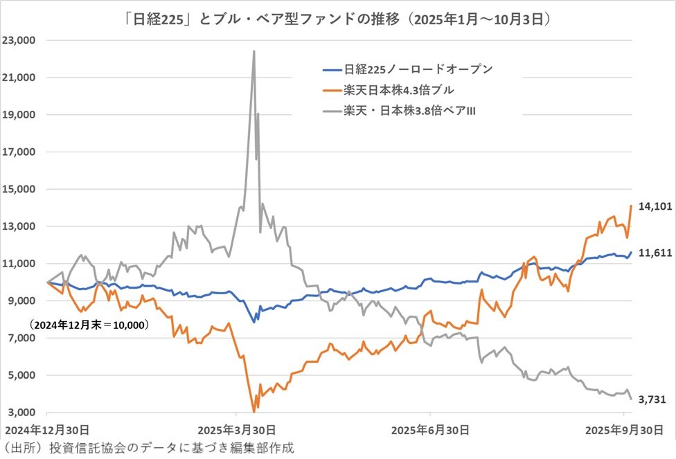 マネックス証券の売れ筋ランキングで2025年9月、「楽天日本株4.3倍ブル」がついにトップに立った。「レバレッジ型」といわれるファンドで、「株価指数先物取引を活用し、日々の基準価額の値動きが、わが国の株式市場全体の日々の値動き(日々の騰落率)のおおむね4.3倍程度となることを目指して運用する」としている。「4.3倍ブル」の場合、国内株式市場が1日で1%値上がりした場合、4.3%値上がりするイメージだ。「ブル型」は対象資産が上昇している場合は非常に効率的に資産を増やすことができるアイテムになる。反対に1%値下がりした場合には4.3%値下がりすることになり、大きな損失につながる。