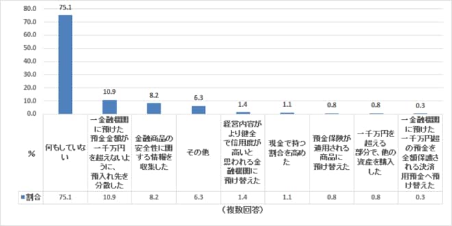 次いで「一金融機関に預けた預金金額が一千万円を超えないように、預け先を分散した」が10.9%。万が一、金融機関が破綻した場合でも原則として預金等は戻ってくる。ただし各種条件があり、金額面では1金融機関ごとに預金者1人当たり元本1000万円までと破綻日までの利息等に限られる。そのため複数の金融機関に資金を分散することで注意しているというわけだ。