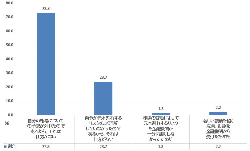 次いで「自分が元本割れするリスクをよく理解していなかったのであるから、それは仕方がない」が23.7%。こちらは単身世帯(19.8%)に比べて3.9ポイント高い。